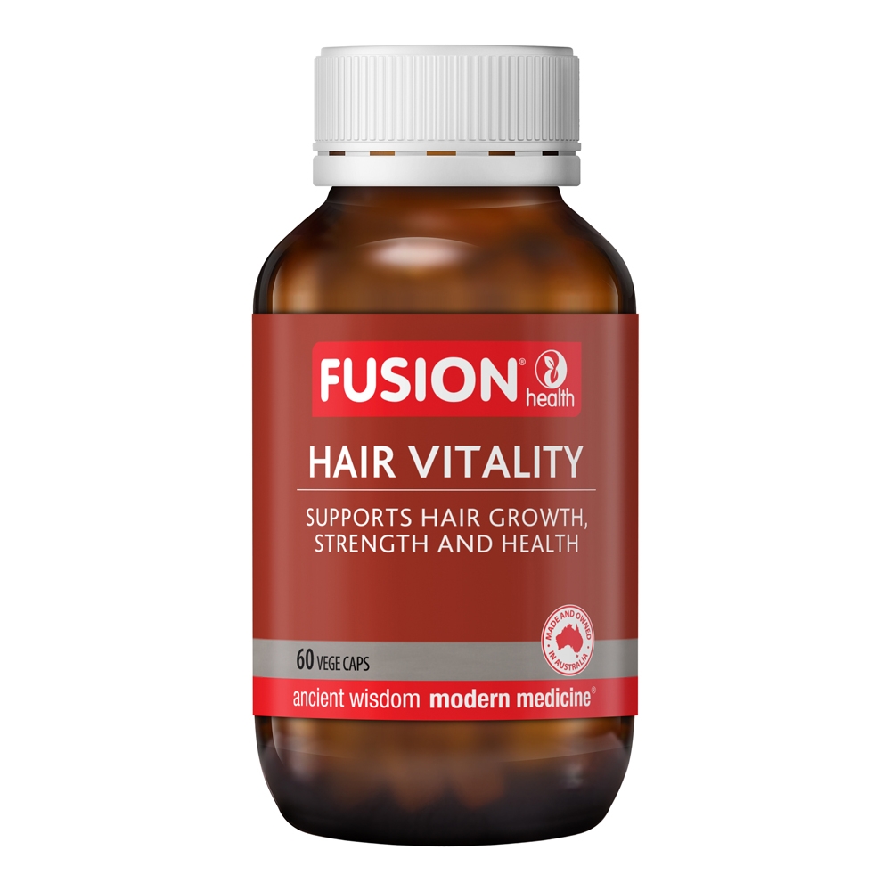 Fusion Health Hair Vitality supports hair growth and strength. With PureSeaTM, a certified organic, sustainably harvested seaweed that naturally contains iodine to support healthy thyroid gland function, necessary in maintaining hair growth. Also contains biotin, silica and zinc to maintain hair strength and amla traditionally used in Ayurvedic medicine to reduce hair loss and thinning while promoting hair growth.